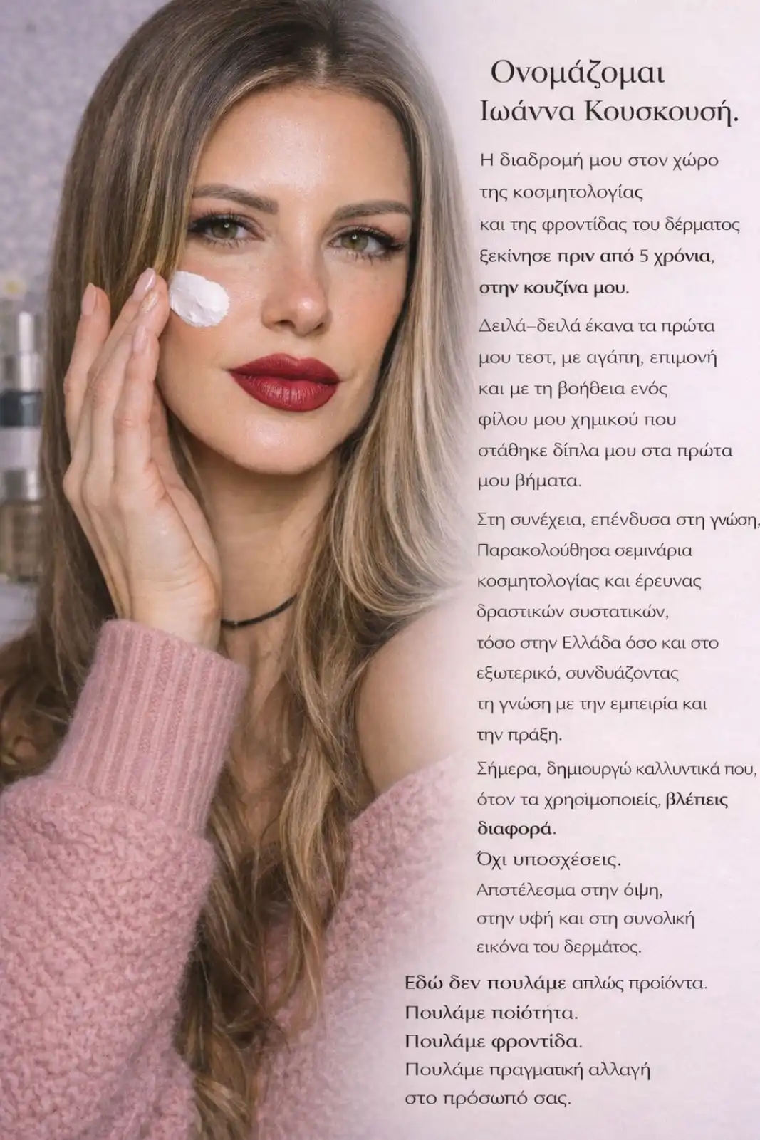 Κάθε προϊόν δημιουργείται με σεβασμό στο δέρμα και στα μαλλιά, χωρίς περιττά πρόσθετα, με στόχο αληθινά αποτελέσματα. Δεν πρόκειται απλώς για καλλυντικά· είναι τελετουργίες φροντίδας που βοηθούν την επιδερμίδα και τα μαλλιά να επανέλθουν στη φυσική τους ισορροπία.